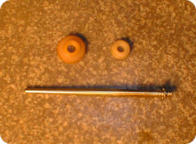 ダイヤフラムを逆さまにするとジェットニードルが抜けてきます。 この写真では右の先端部分にEリングがはまっていてジェットニードル側にはそれをはめるための溝が5つほってあります。 規定値はその真ん中なのでEリングの前後それぞれに2つずつの溝があるはずです。そうでなければ規定値を外してます。 ちなみにEリングは工具を使わなくてもとぎれてる部分を平らなものに押し付ければ簡単に外れます。 それからこのEリングの位置を変えることでメイン系の混合比の調整ができます。 写真でみて左にいくほど濃くなり、右にいくほど薄くなります。ですが、お勧めはできません。 もしどうしても気になる位調子が悪ければ他の部分の不具合を疑うべきです。 ジェットニードルをピストンバルブの中に戻すときは写真でみてプラリングの小さいほうをEリングより左側、 大きいほうを右側に取り付けます。 |